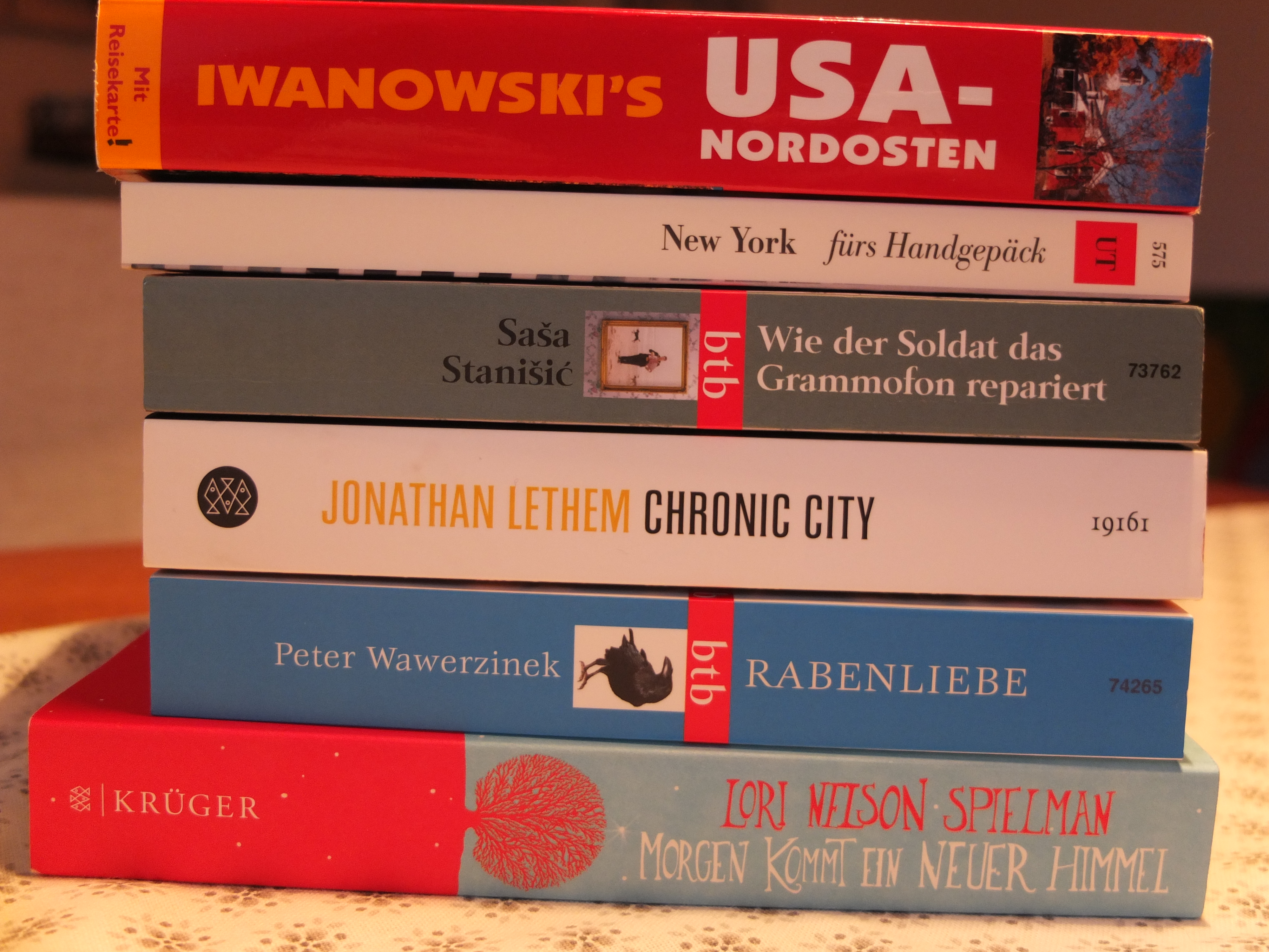 Zweimal New-York-Literatur, Geburtstagsgeschenke aufmerksamer Freunde: klare Sache. Stanisic hatte ich mir extra aufgespart und mich schon lange drauf gefreut: muss mit. Reiseführer: Ja. Will Tagesausflüge auf konservative Art planen. Unterhaltungsroman mit froher Botschaft: Ja, fürs Warten am Flughafen, wenn ich vergessen will, wo ich gerade bin. Wawerzinek: Heute überraschend geschenkt bekommen, wollte ich schon lange lesen, wichtiges Gegengewicht zum Unterhaltungsroman. Also keine Chance auf Minimierung in diesem Gepäck-Sektor.