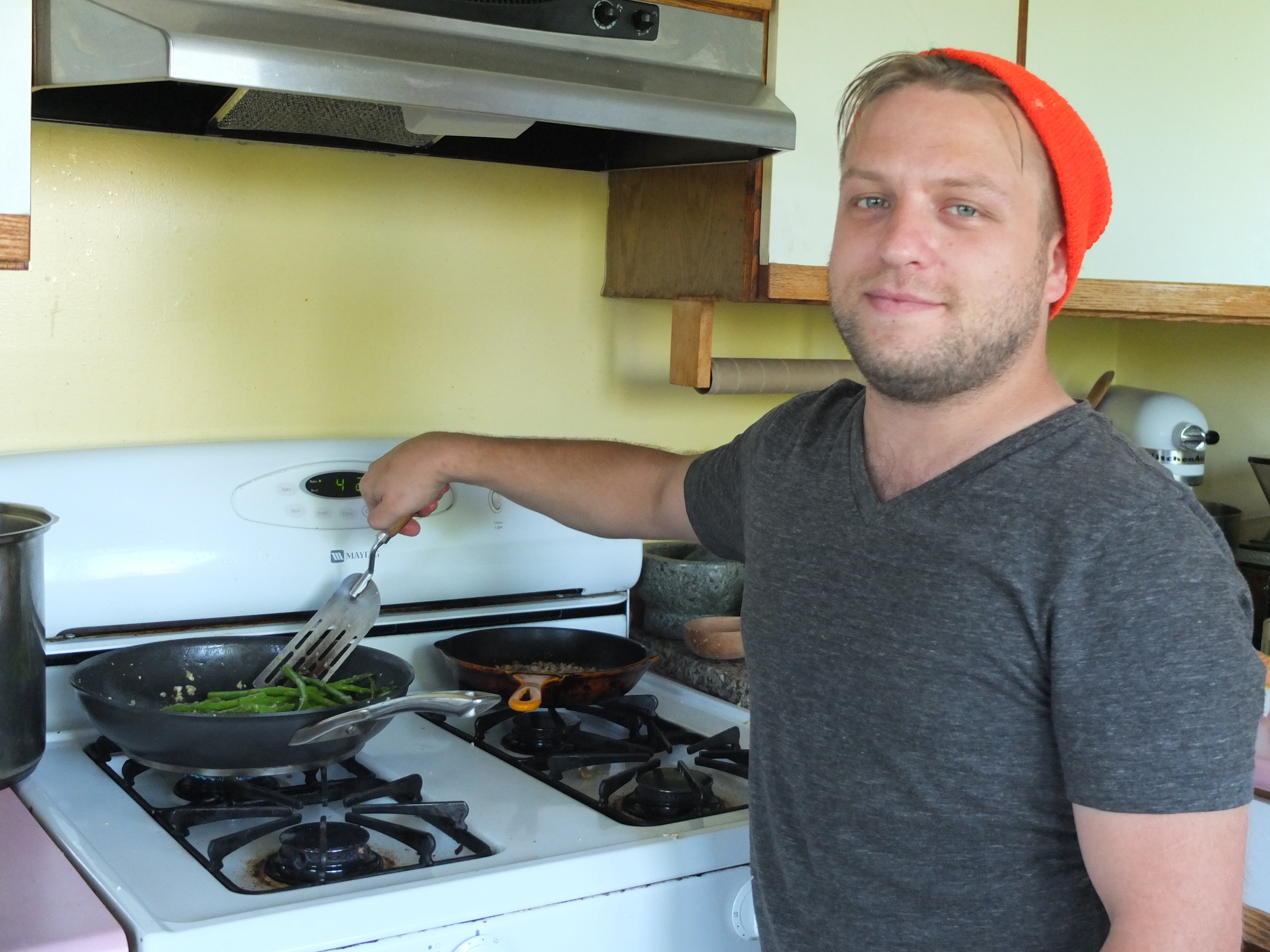 Am Ende der Stunde haben wir zusammen „Ring of Fire“ gesungen – und gespielt! Ein sehr freundliches Anfänger-Instrument. Und zur Belohnung gab es Dinner, gekocht von Eric (mit Mütze) und Cameron.
