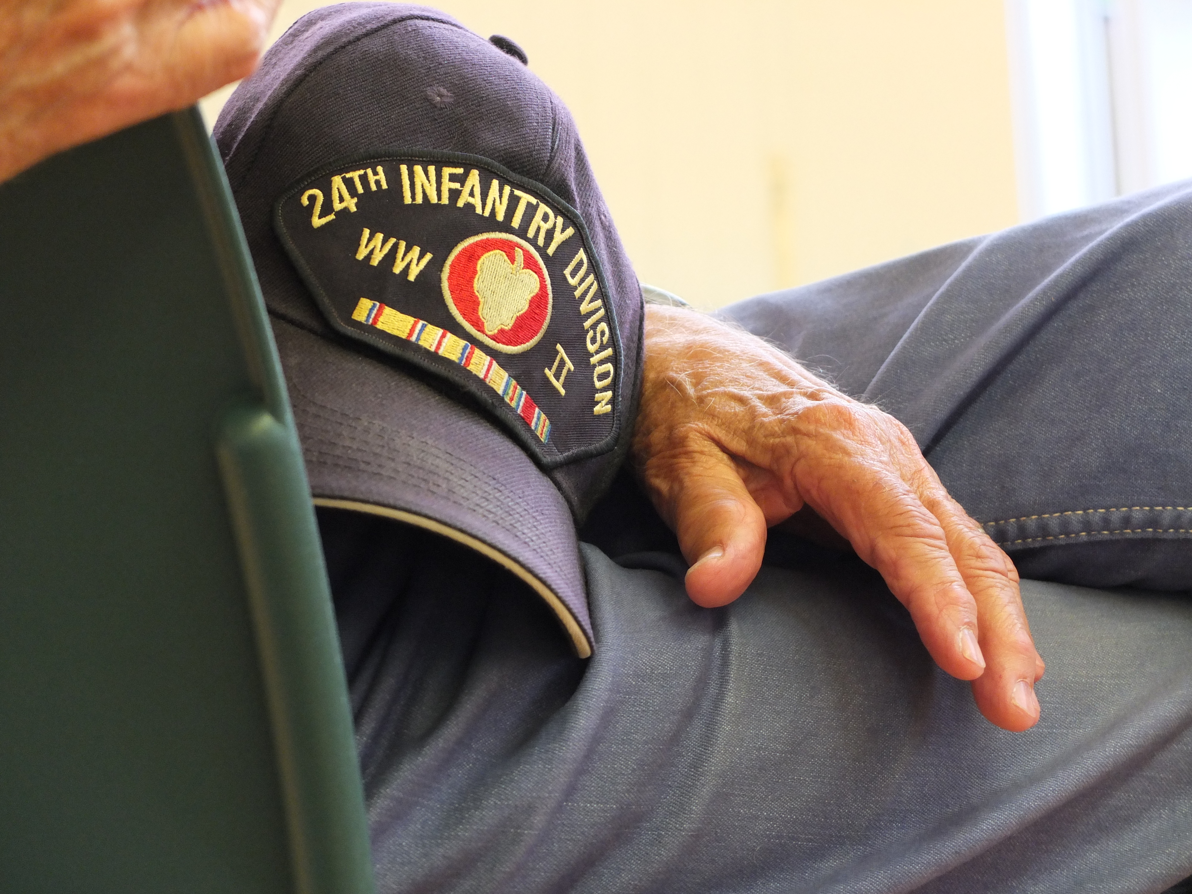 Das letzte Foto des Abends ist nicht von Bob. Ich mag es aber so gerne, deshalb zeige ich es, obwohl ich versäumt habe, den Träger dieser besonderen Kappe um sein Einverständnis zu bitten. Sie lässt ihn als Mitglied der 24. Infanteriedivision der US-Armee erkennen und als Veteran des Zweiten Weltkriegs.