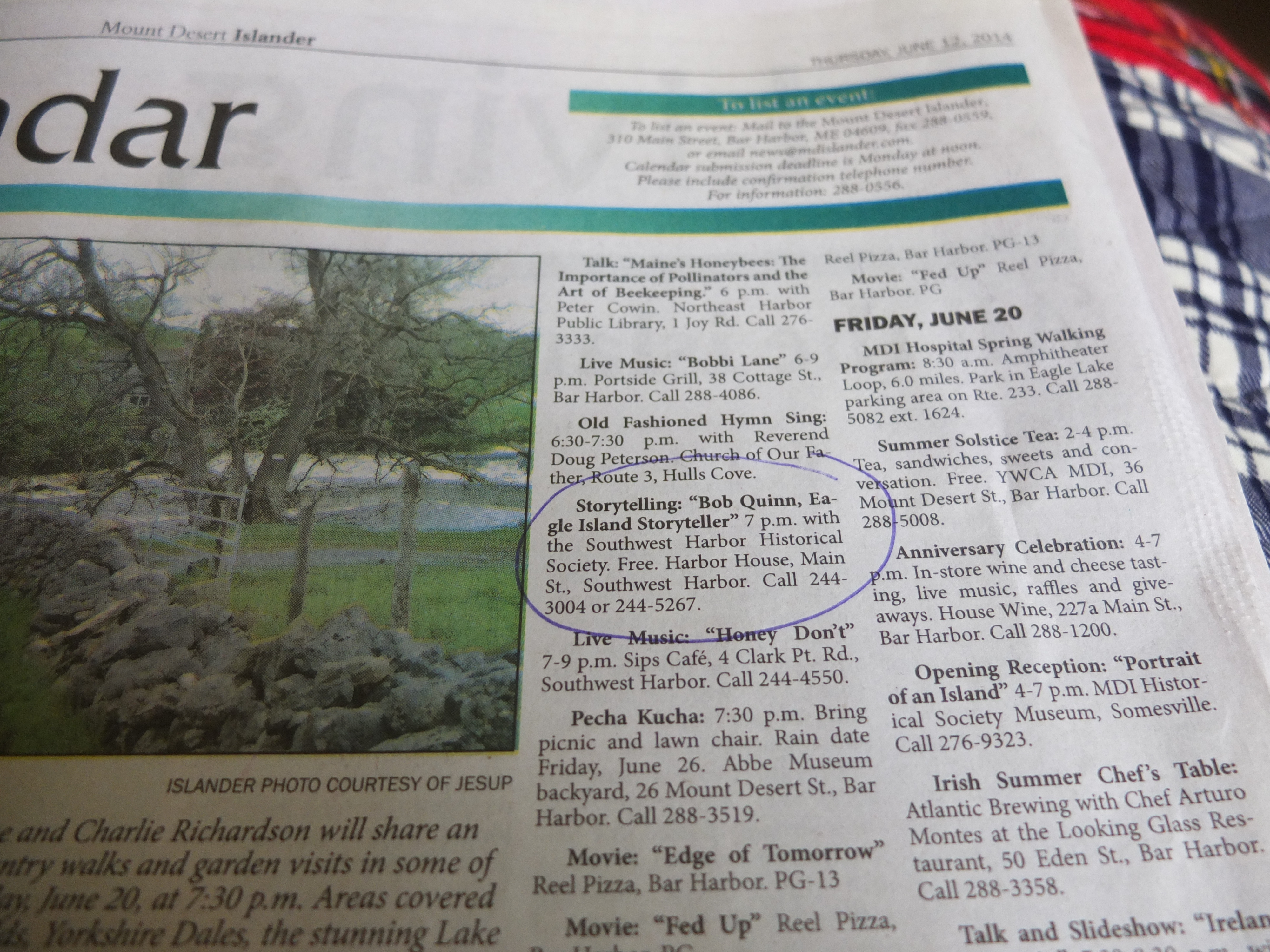 Der erste Abend an einem neuen Ort: Wer ein Gefühl dafür bekommen möchte, wo er gelandet ist, sollte einen Blick in den Veranstaltungskalender der Lokalzeitung werfen. Das hat mir Carol klar gemacht, meine Zimmer-Vermieterin in Southwest Harbour. Sie schwankte noch, welchen Vortrag sie an diesem Abend hören wollte. Zur Wahl standen „Die Bedeutung der Bienen für Maine“ und „Bob Quinn, ein Geschichtenerzähler von Eagle Island“. Natürlich war ich für Bob Quinn – auch, wenn mir der Name nichts sagte. Hauptsache, Geschichten.
