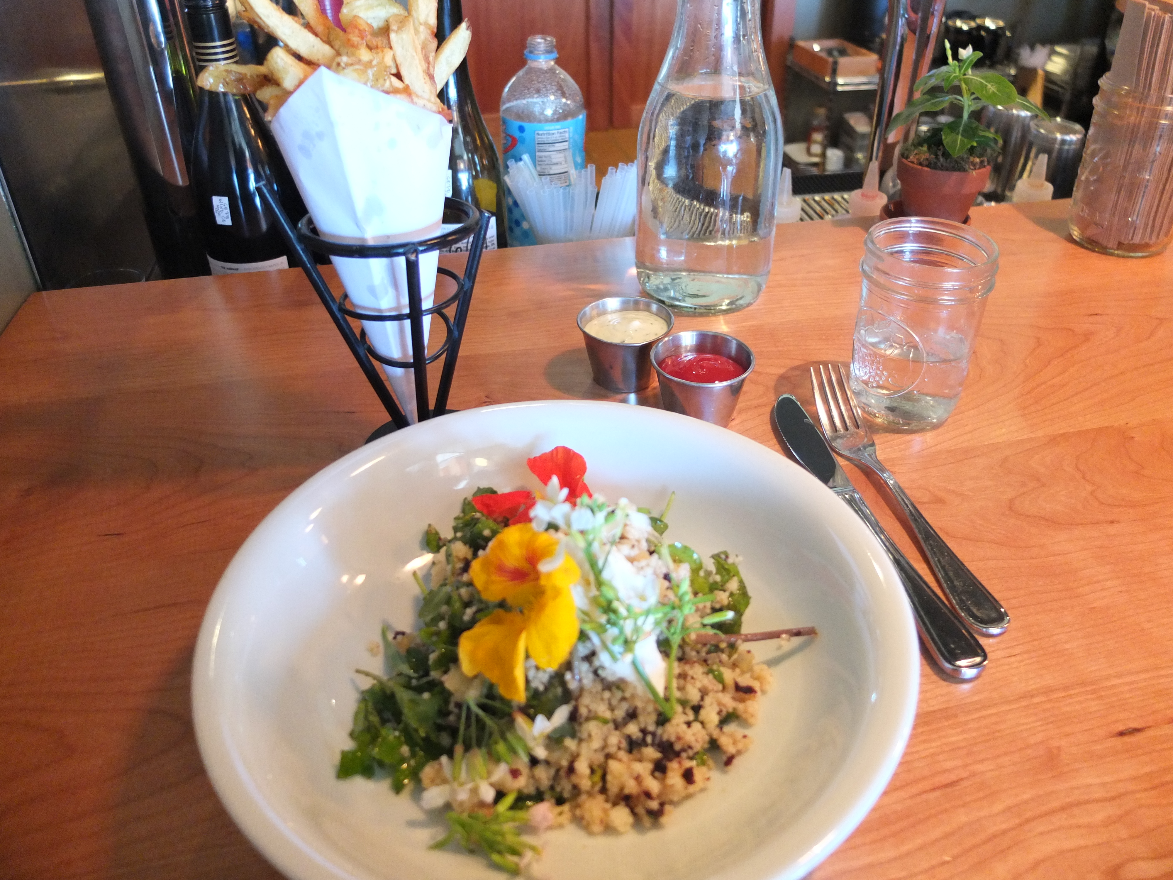 Dann weiterlaufen nach Munjoy Hill, weil das hip sein soll. Dort das Duckfat entdecken und den leckersten Salat der Welt essen – Couscous mit Wildblumen! Dazu Pommes, mal wieder handgeschnitten (frage mich schon länger, warum die handgeschnittenen Pommes überall gleich aussehen?!). Dann wieder herumstromern und merken, dass Galerien heute doch nicht wichtig sind. Stattdessen: Kino.