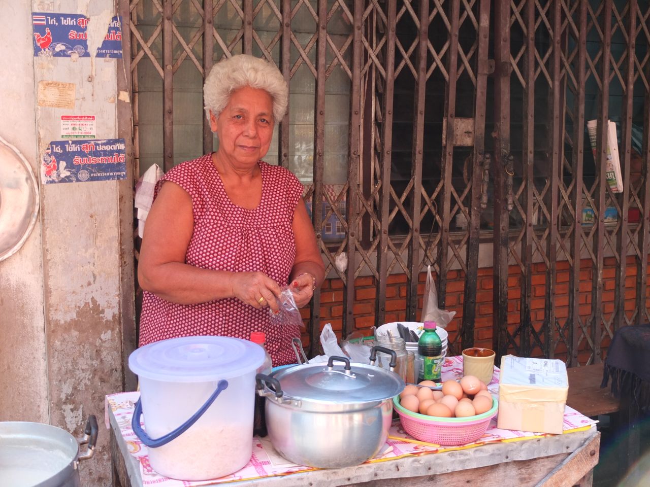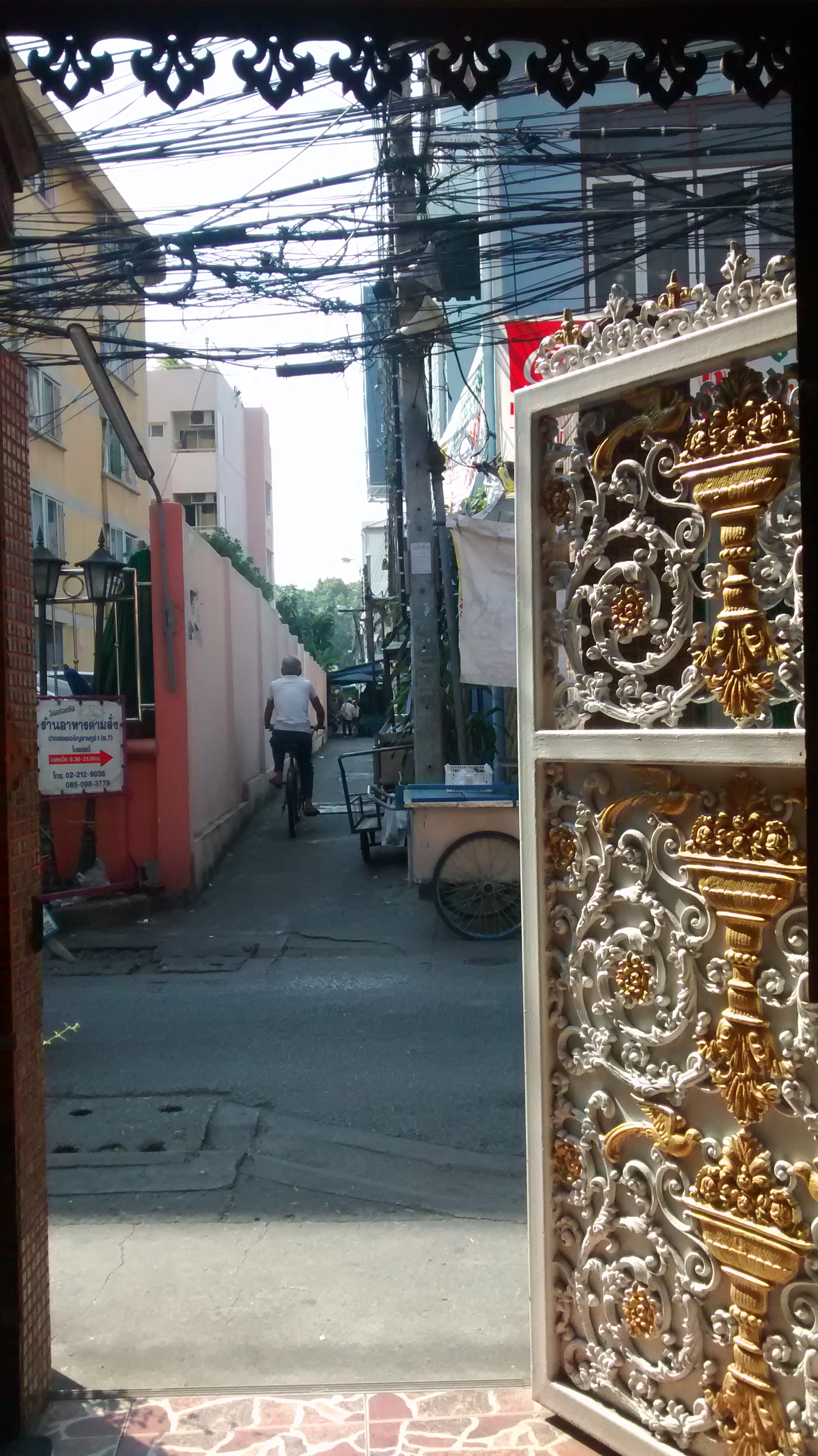 Ich sitze in der kleinen Lobby meiner Pension. Der Raum ist an zwei Seiten offen, mit Blick auf die Gassen, die an der Hausecke aufeinander treffen. Draußen ist einiges los: Alte Frauen machen schlurfend und gebeugt Einkäufe, junge Männer schieben ihre Tuktuk-Obstläden vorbei, ein Motorroller nach dem anderen knattert ums Eck. Die wenigen Autos passen nur mit Mühe durch, Touristen hab ich außer mir bisher heute zwei gezählt. Davon hatte mir niemand erzählt: Ein Dorf in der Megacity. Ich hatte Angst davor, mich in Bangkok verloren zu fühlen. Als ich eben einen Schritt vor die Tür gemacht habe, winkte mir die Frau zu, bei der ich gestern Hühnersuppe gekauft habe. Ich bin seit 24 Stunden hier. Kaum zu glauben, was in das bisschen Zeit passt, wenn man Glück hat. Gäbe es keine Kakerlaken, wäre mein Glück vollkommen. Aber zurück zur netten Nachbarin, hier ist sie: