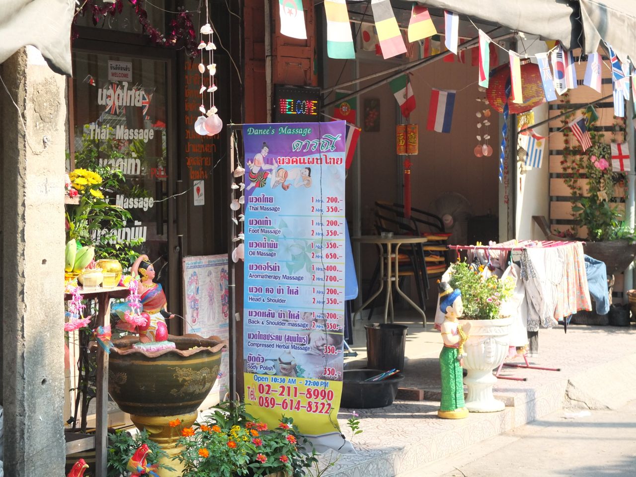 Nach der Massage, ich will gerade aus dem Salon schweben, bedeutet sie mir, dass der Tee dort für mich sei. Ingwertee. Ich fühle mich sehr gut behandelt. Wir setzen uns in den Empfangsraum des Salons und unterhalten uns. „Are you from Bangkok?“, frage ich sie. Im Grunde eher so: Ich zeige auf sie und sage „Bangkok?“. No no, sagt sie und nennt einen Ort, den ich nicht kenne. „Far from here?“ Fragendes Lächeln. Ich gestikuliere, sie fängt an, Orte aufzuzählen, die in der Nähe ihrer Heimat liegen (glaub ich). Chiang Mai höre ich. Oh, Chiang Mai, I am going there, sage ich und zeige auf mich. Sie freut sich. Daumen hoch, Chiang Mai beautiful. Daumen hoch auch zur Information, dass ich aus Deutschland komme. Germany, super. Und dass ich alleine reise: auch super. Ich erfahre, dass sie seit fünf Jahren Masseurin ist. Wo sie es gelernt hat, verstehe ich leider nicht. Ich darf sie fotografieren. Am Abend komme ich noch einmal an ihrem Salon vorbei, sie sitzt immer noch dort.