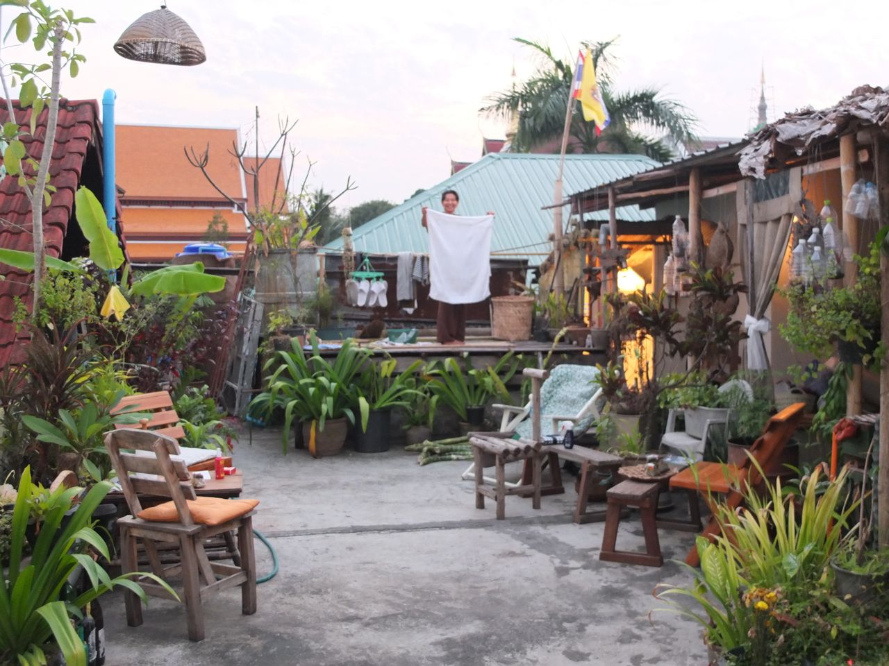 Gerade läuft zum zweiten Mal eine Ratte die Brüstung des Dachgartens entlang. Ich glaube, sie ist auf dem Weg zum Geisterhäuschen, um sich an den Opfergaben gütlich zu tun. Diese Altäre, die wie Mini-Tempel gebaut sind, stehen hier an jedem Gebäude und an 1000 anderen Orten – auch Thailand-Anfänger wie ich können sie nicht übersehen.