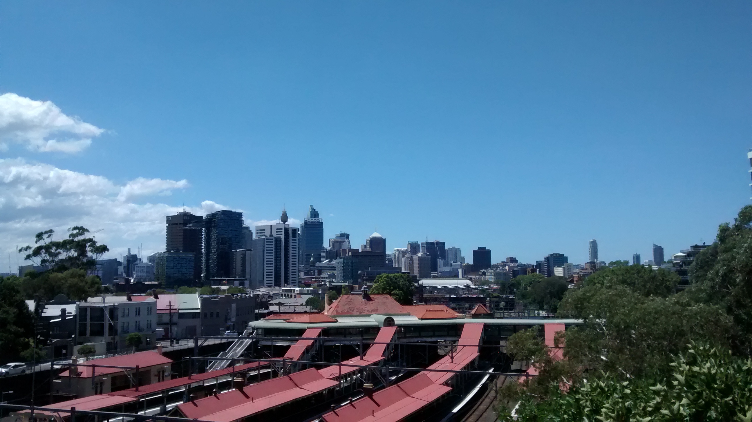 Wer die Stadt kennt, wird das folgende Bild als Beweis akzeptieren. Es ist ein erstes Handyfoto aus meiner Unterkunft. Im Vordergrund der Bahnhof von Redfern, und dahinter, nun – das muss wohl die Skyline Sydneys sein. Ich geh jetzt mal gucken. Da ich unter Schlafentzug leide, wird jeder Eindruck doppelt so intensiv wirken wie unter normalen Umständen. Ich freu mich schon.