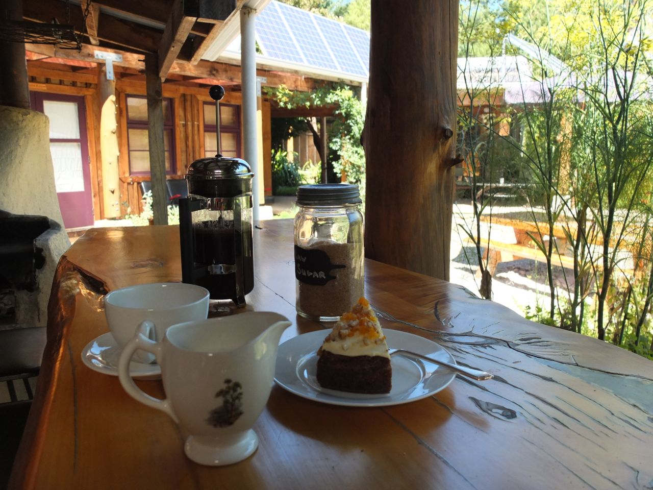 Aber ich greife vor: Als allererstes, kaum, dass er die Schubkarre abgesetzt hat, fragt mich Tom, ob ich lieber Kaffee oder Tee zu meinem Kuchen möchte. Seine Frau Norma und Sohn Duncan kommen dazu, um mich zu begrüßen. Mit strahlendem Lächeln und sehr vielen freundlichen Worten. Tom serviert mir Normas Möhrenkuchen und Kaffee auf einer der vielen Terrassen dieses Hauses. Ich freue mich so. Im Laufe des Tages werde ich sehen, dass jeder Gast so empfangen wird. Und jeder wird davon froh.