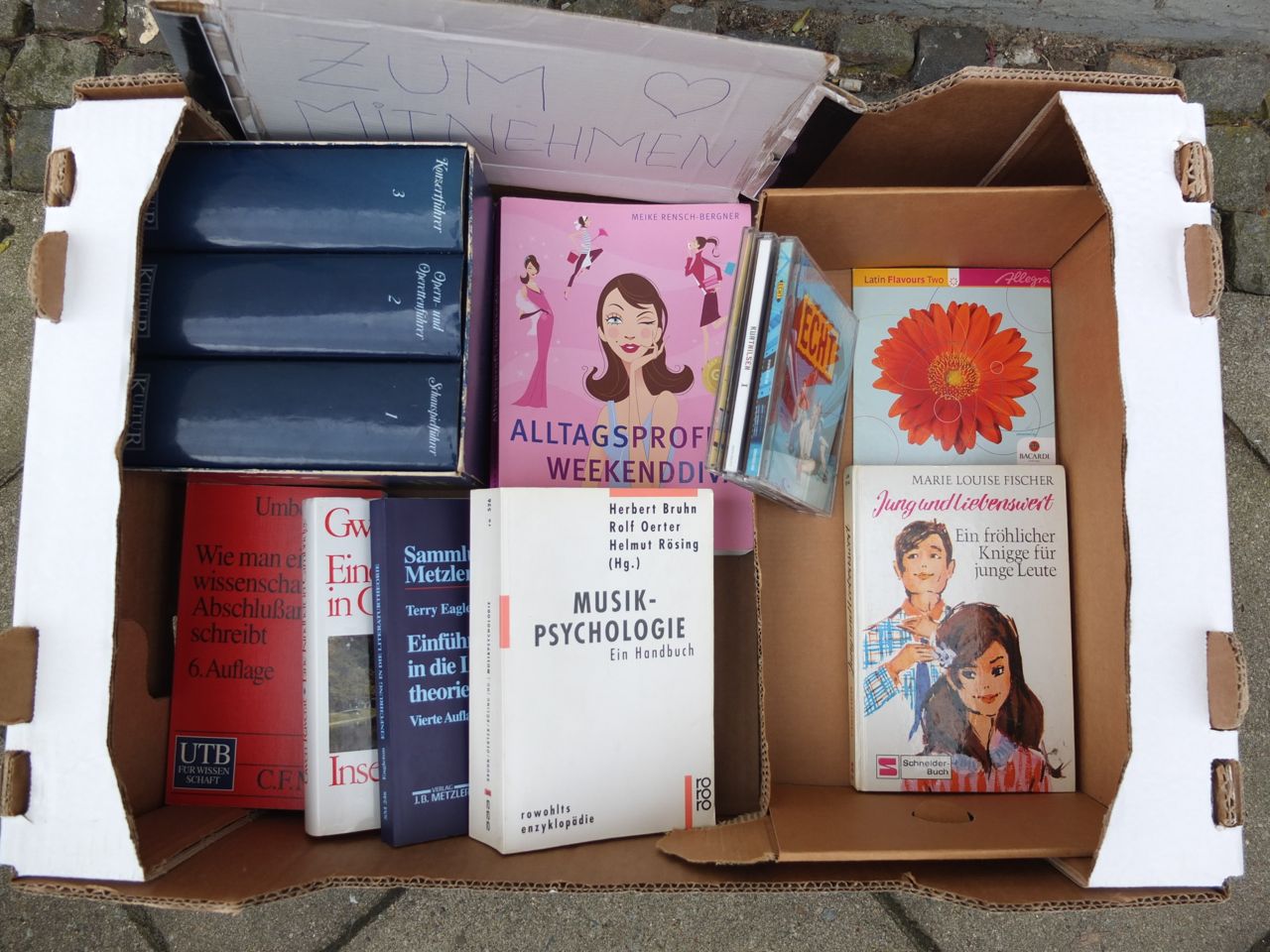 Es gab aber auch Angesammeltes, das ich den Gefahren der Straße ausgesetzt habe. Hatte ich noch nie gemacht: einen Karton voller Bücher und CDs vors Haus gestellt, zur Selbstbedienung. Ich weiß nicht, wieso ich das so aufregend fand. Man lässt die Passanten per Mitnahmeaktivität über die Coolness (und das Gegenteil) der eigenen Vergangenheit abstimmen – vielleicht deshalb? Leider habe ich versäumt, den Start-Status zu fotografieren. Aber nach einer Stunde sah der vormals volle Karton so aus: