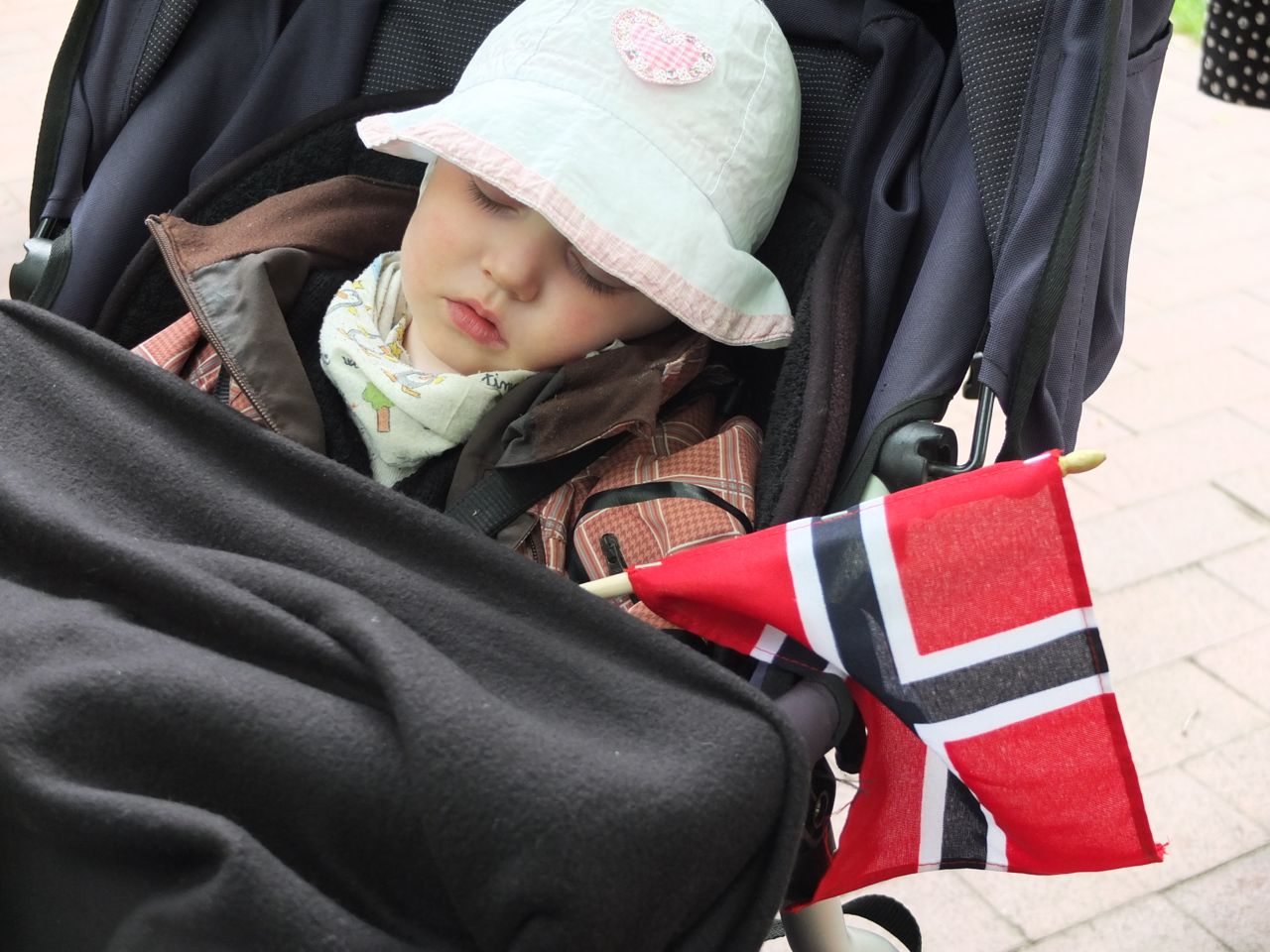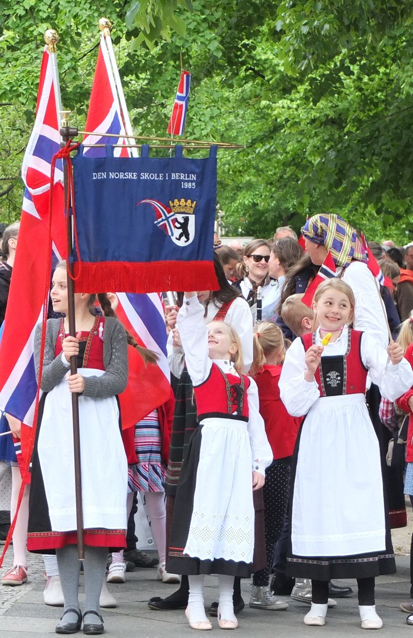 Die kleine Demonstration norwegischer Lebenslust hat ordnungshalber drei Polizisten als Begleitung dabei, bestimmt ein angenehmer Einsatz. Später sehe ich die drei mitten im Festgetümmel Würstchen essen. Aber zuerst gehen sie mit der ganzen Bande um den Block. Allen voran: die Fahnenträgerin mit dem Banner der norwegischen Schule in Berlin.