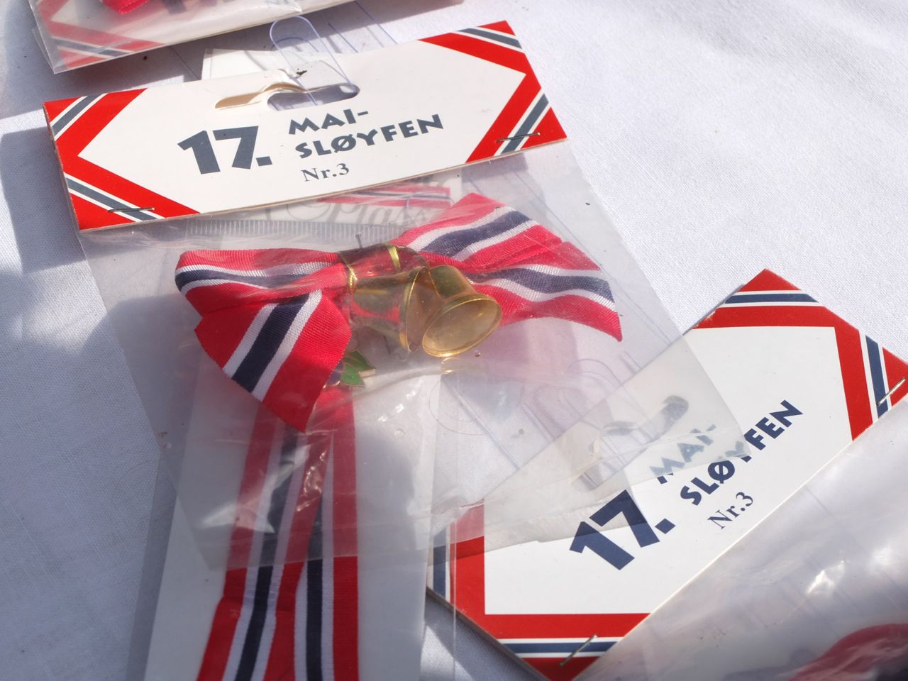 Merethes großer Sohn Marius läuft dieses Jahr als Russ mit im 17.Mai-Umzug, also als Abiturient. In einem ulkigen roten Overall, den er wie alle Abiturienten schon seit Wochen trägt. Vor unendlich vielen Jahrzehnten war ich mal dabei, in Bergen. Mit einer Schleife an der Bluse. Denn ich hatte zwar keine Tracht und auch keinen stinkigen roten Anzug, aber schick machen war Pflicht. Hier, solche Schleifen, die gab’s heute auch zu kaufen: